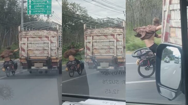 Один шаг от смерти: Велосипедист хватается за грузовик на дороге Пхукета