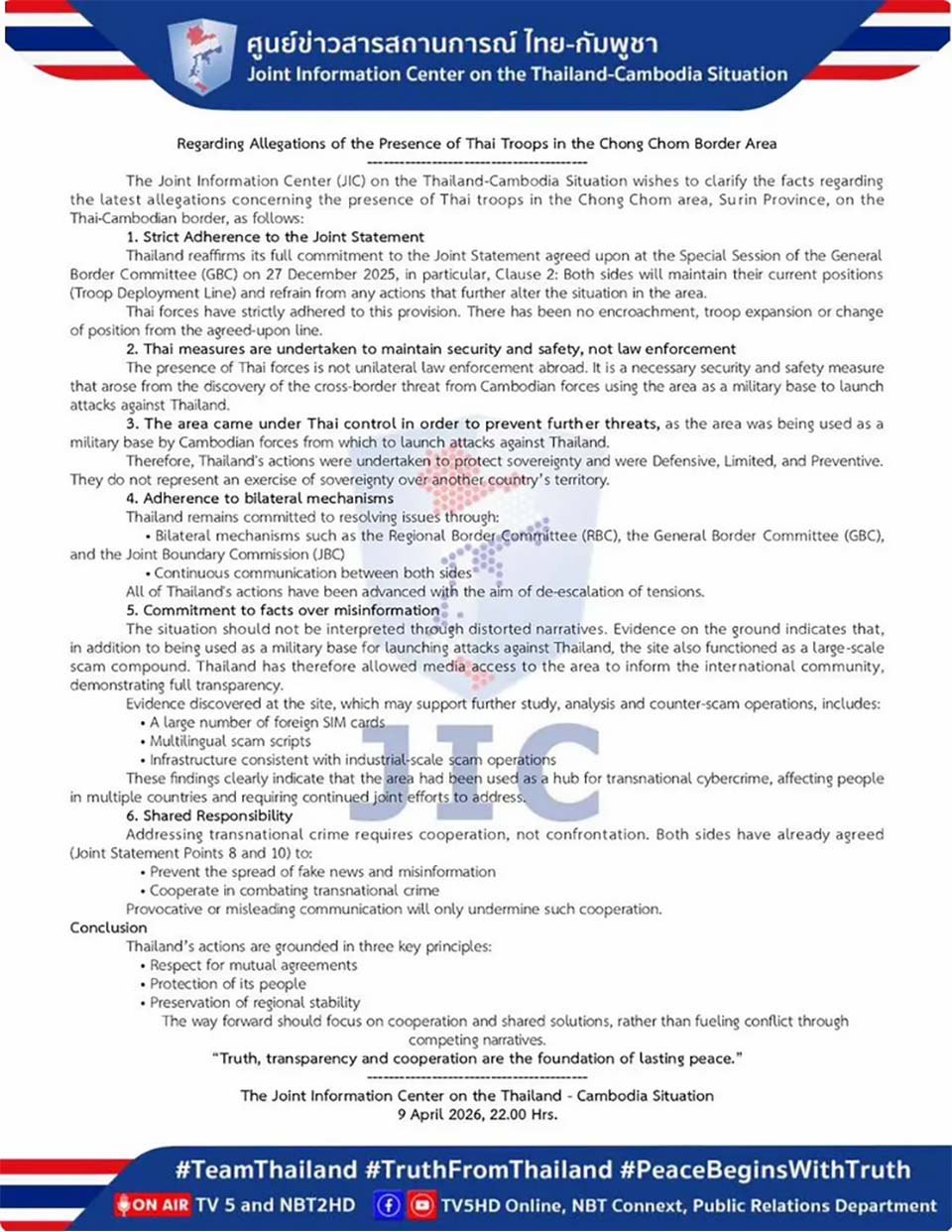 БАНГКОК, Таиланд – Совместный информационный центр по ситуации между Таиландом и Камбоджей выпустил разъяснение относительно обвинений в присутствии тайских войск в приграничной зоне Чонг Чом в провинции Сурин. Власти заявили, что тайские силы остаются на позициях, согласованных в рамках Генерального пограничного комитета, и не расширяли и не изменяли линии развертывания. Официальные лица […]