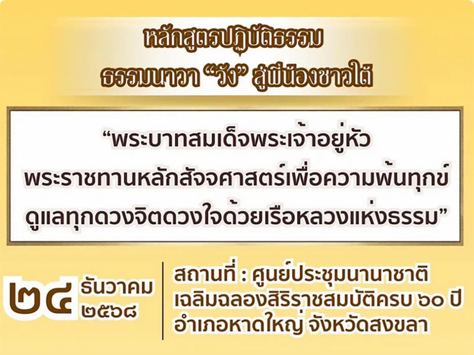 БАНГКОК, Таиланд – Граждане приглашены участвовать в программе практики Дхамманавы «Ванг», которая пройдет в среду, 24 декабря 2025 года, в Международном конференц-центре 60-й годовщины восшествия Его Величества Короля в районе Хат Яй, провинция Сонгкхла. Программа основана на принципах Сачатасата, милостиво […]
