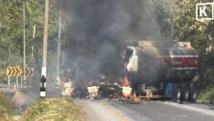 Авария нефтяного танкера вызывает пожар на горной дороге Кората