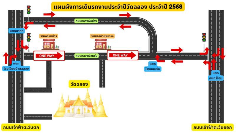 Полиция Чалонга временно реорганизовала движение по дороге Luang Pho Chaem Rd. Как и в предыдущие годы, идущая за храмом Wat Chalong улица сделана односторонней на время ярмарки Wat Chalong Fair. Движение возможно только с запада на восток – и очень медленно.