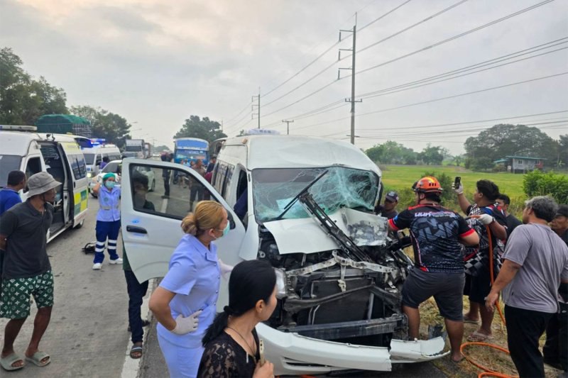 Двадцать пятеро студентов получили травмы, двое из них оказались зажатыми в обломках, когда школьный фургон столкнулся с сонгтэо, перевозившим студентов, в районе Банг Пла Ма в Супханбури в среду утром.