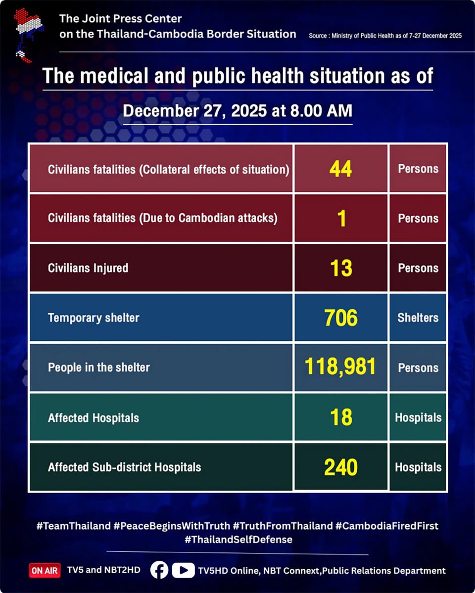 БАНГКОК, Таиланд – Объединенный пресс-центр сообщил о медицинской и общественной здравоохранительной ситуации вдоль границы Таиланд–Камбоджа по состоянию на 27 декабря 2025 года в 08:00. В обновлении сообщается о 45 гражданских жертвах, включая 44 от побочных эффектов и одну от прямых атак Камбоджи. Еще тринадцать гражданских лиц получили ранения. Всего имеется 704 временных укрытия […]