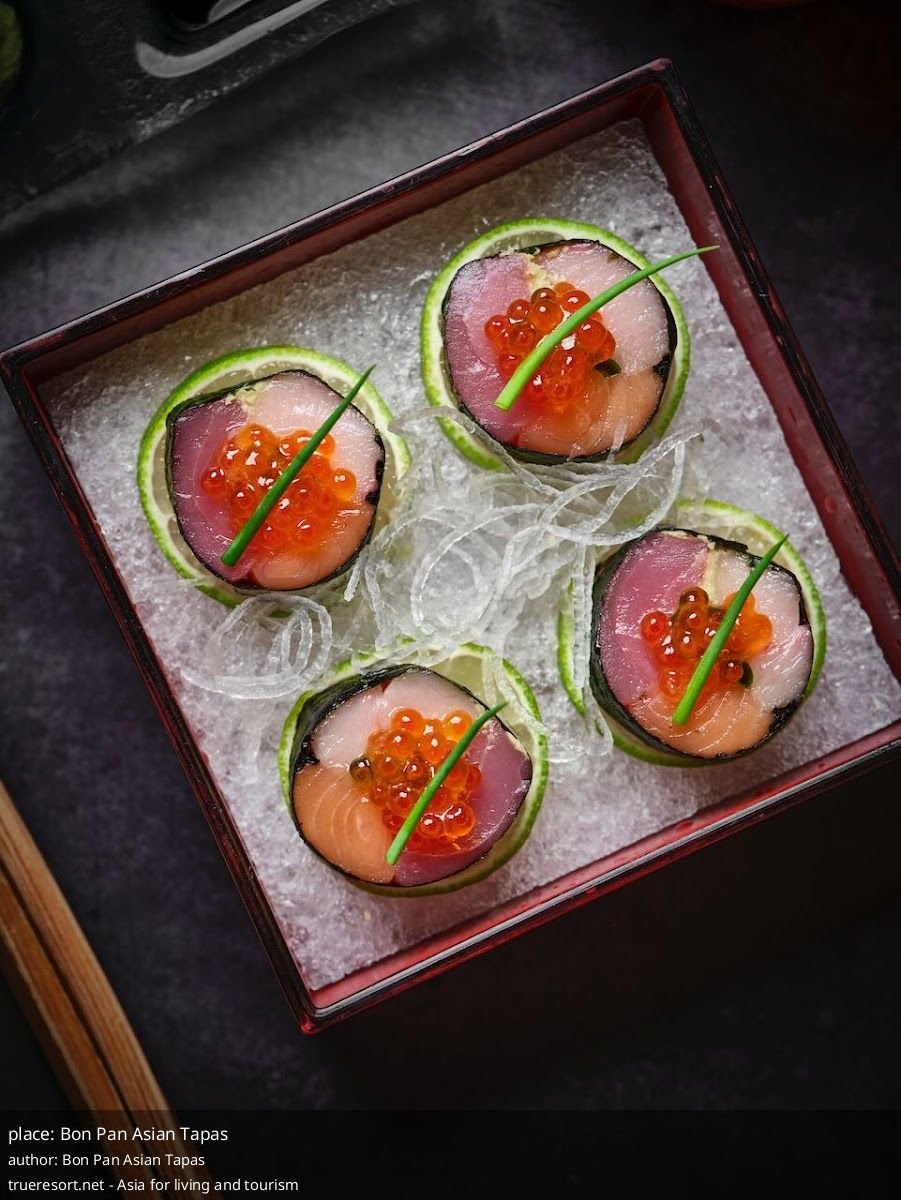 Тексты покупателей выделяют разнообразие азиатских позиций: черная спагетти с лобстером, жёлтое карри с уткой, мини-бургер, якитори BBQ и свиная брюшина, а также рамен и прочие японские блюда — это указывает на широкий фьюжн-спектр кухни. Один гость зафиксировал чек примерно 2 500–2 600 бат на двоих за два основных, три стартерa, два бокa и два напитка; на основе этого алгоритм классифицирует ресторан в сегменте средне‑высокой ценовой категории по локальным меркам. Эстетические детали интерьера, например необычный диспенсер для салфеток, отмечены как фактор запоминания места, что повышает вероятность повторных посещений у посетителей, чувствительных к атмосфере.