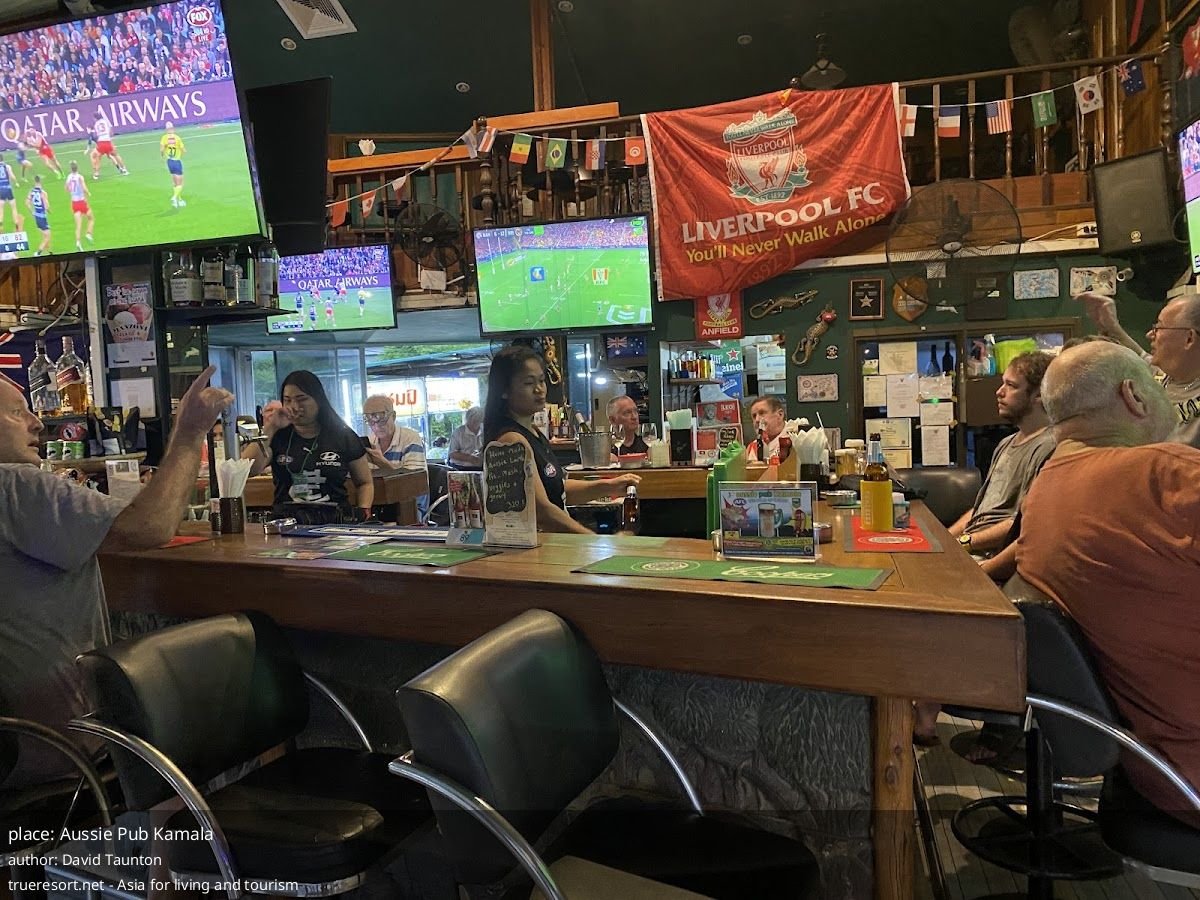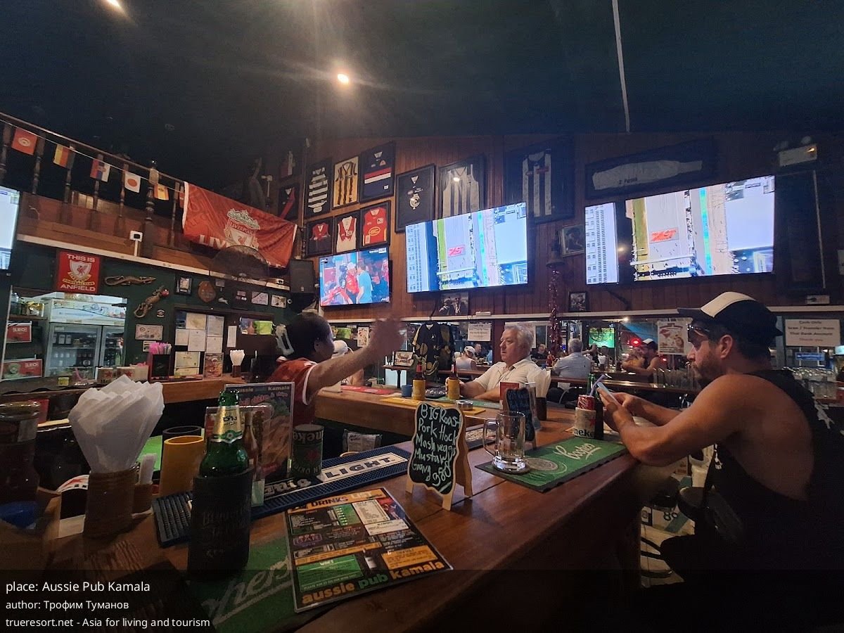 Aussie Pub Kamala в Камале — настоящий австралийский паб для просмотра спортивных трансляций: ледяное пиво, стол для пула и дружелюбная атмосфера, приходите раньше на матчи