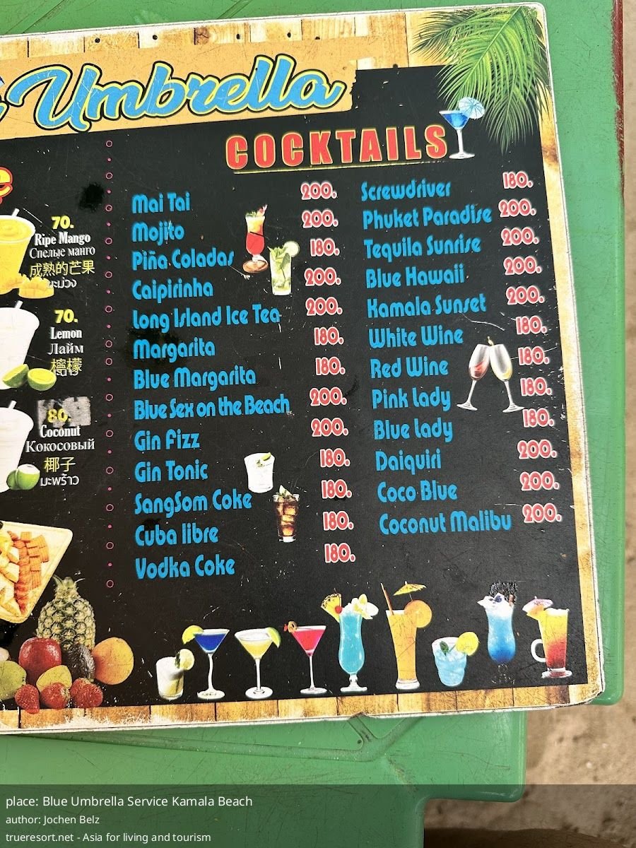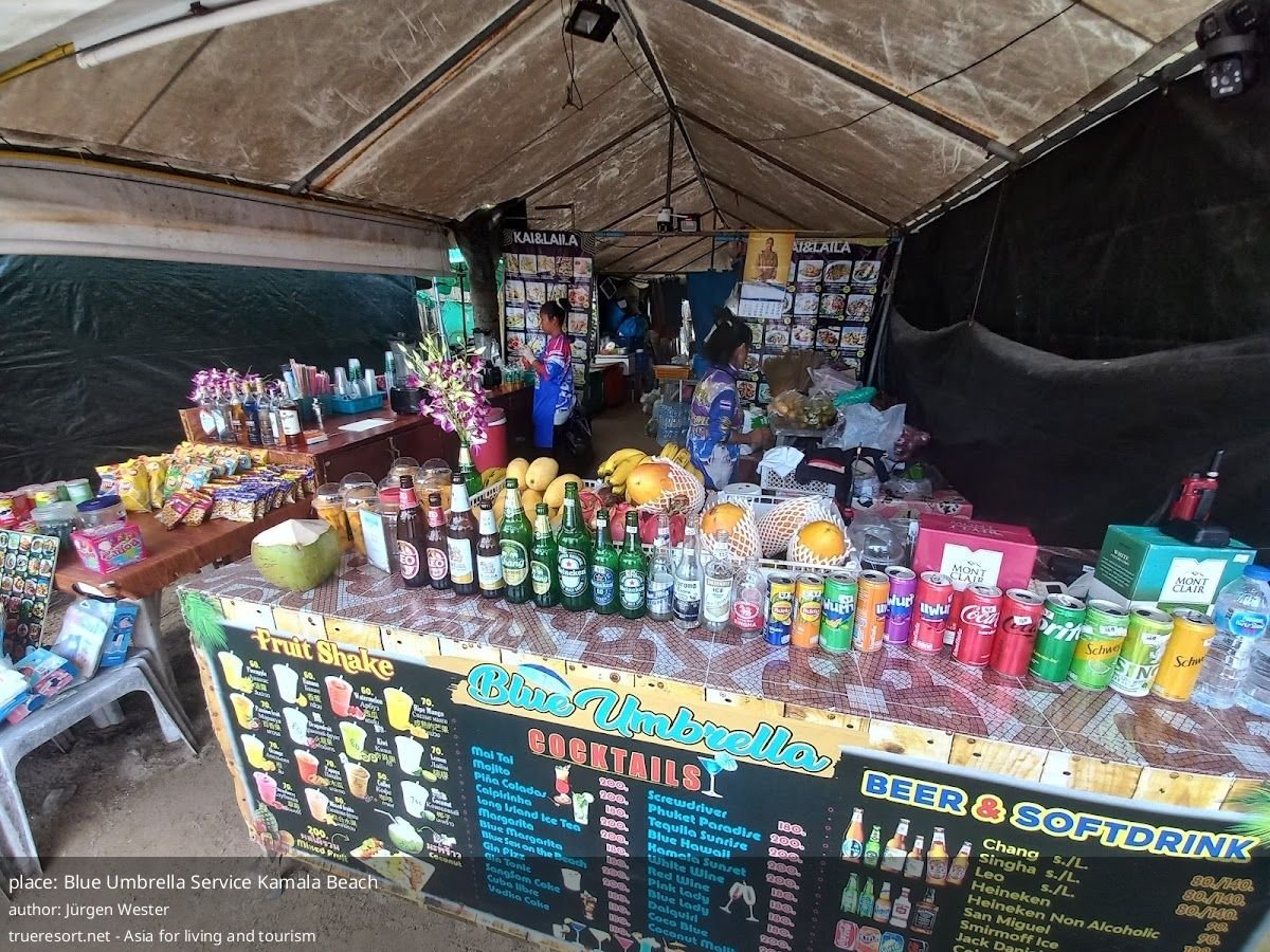 Blue Umbrella Service Kamala Beach — бар на пляже с непревзойденным вниманием персонала: постоянно подстраивают зонты, быстро приносят напитки и заботятся о гостях