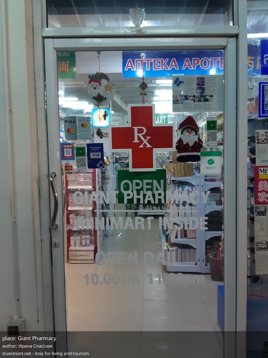 Giant Pharmacy на Karon Beach работает ежедневно 9:00–23:00 — большой выбор и выгодные цены на подгузники, но клиенты жалуются на грубость и ошибки при выдаче лекарств
