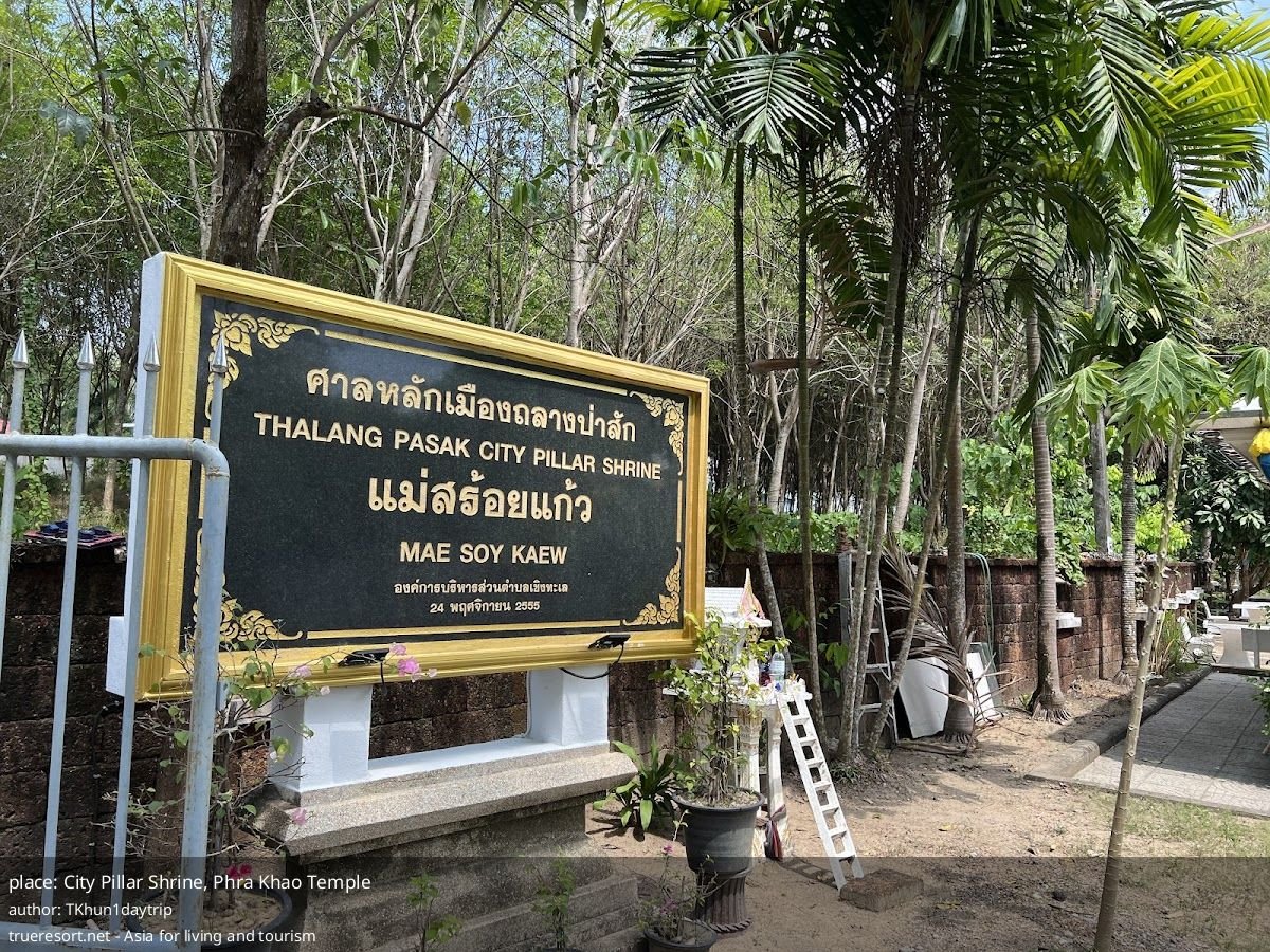 Святилище представлено большой белой беседкой с золотым столбом в центре, расположенной между участками джунглей и большой плантацией ананасов. Его называют Mae Soi Kaew City Pillar Shrine, Pa Sak City Pillar Shrine и Wat Phra Khao City Pillar Shrine; по отзывах это городское столповое святилище для восточной части Пхукета, находится в районе Choeng Thale, в зоне Wat Phra Khao, Soi Pa Sak 4.