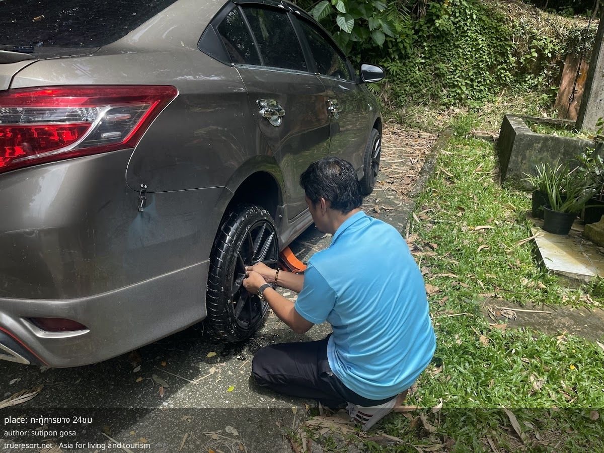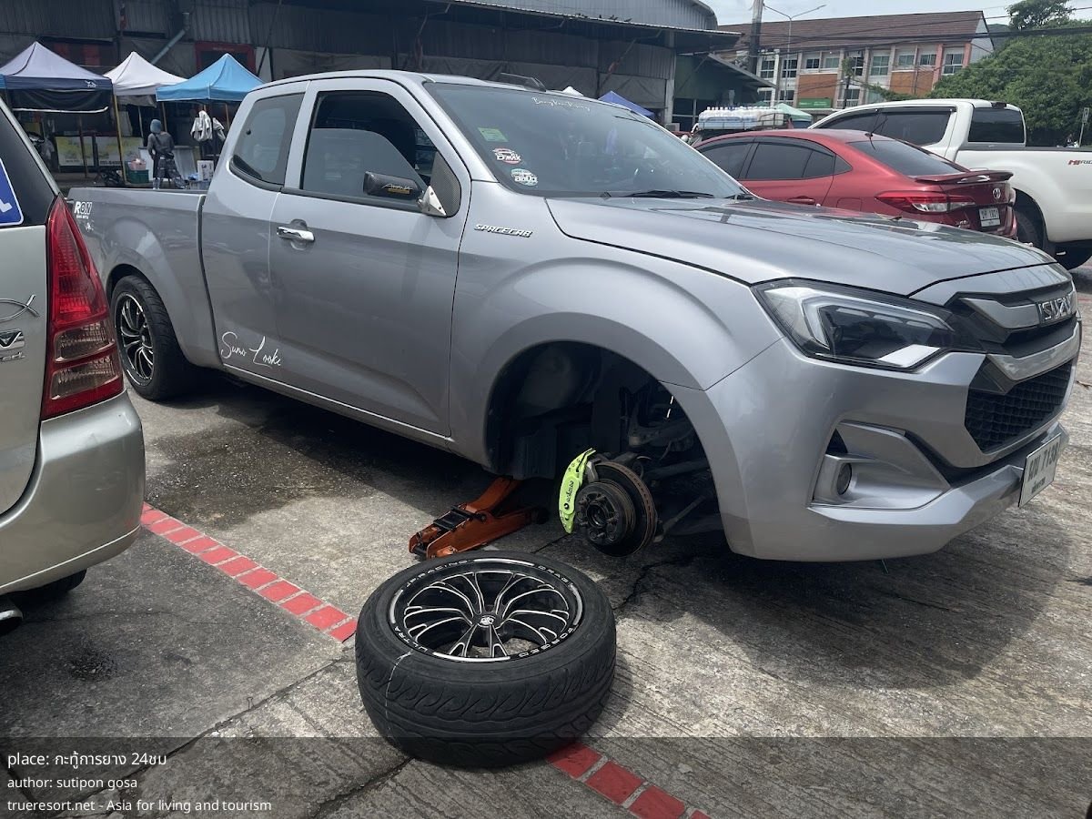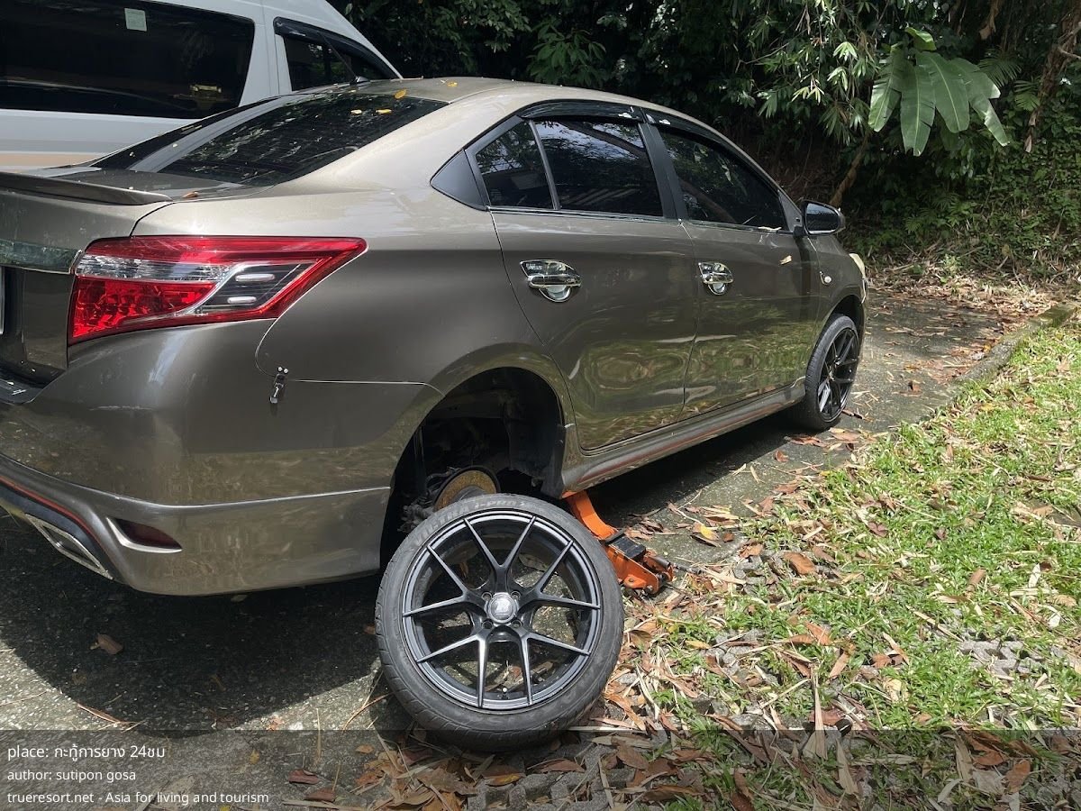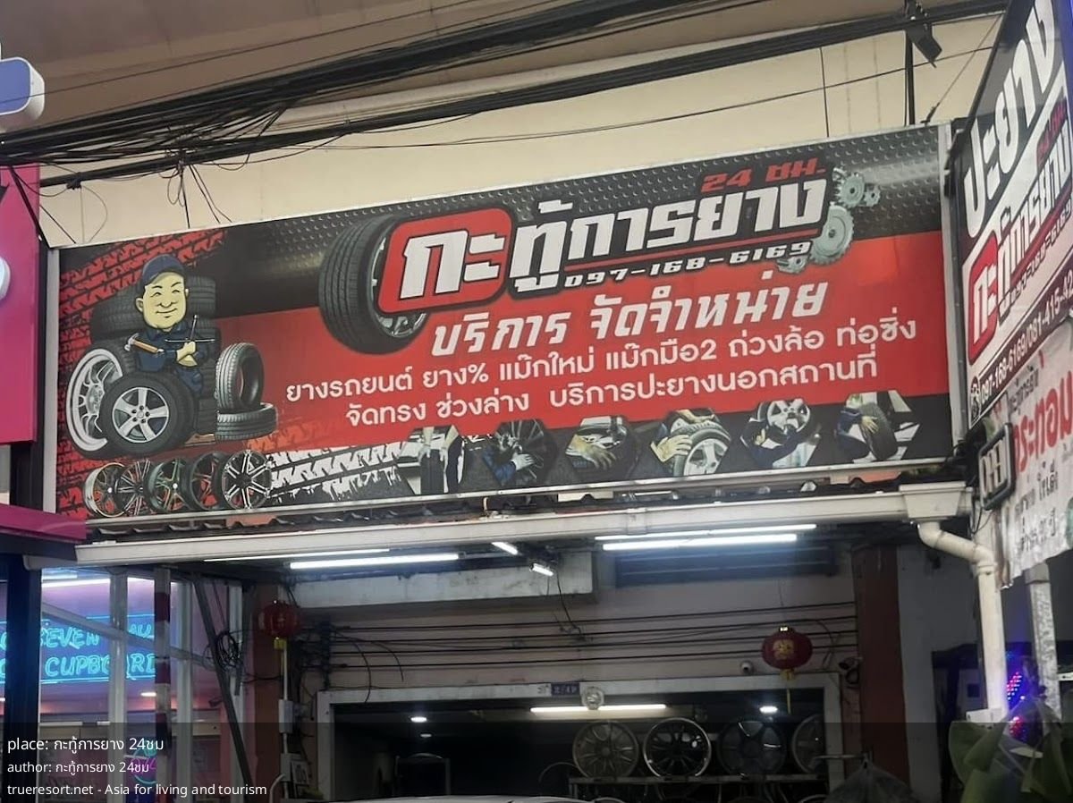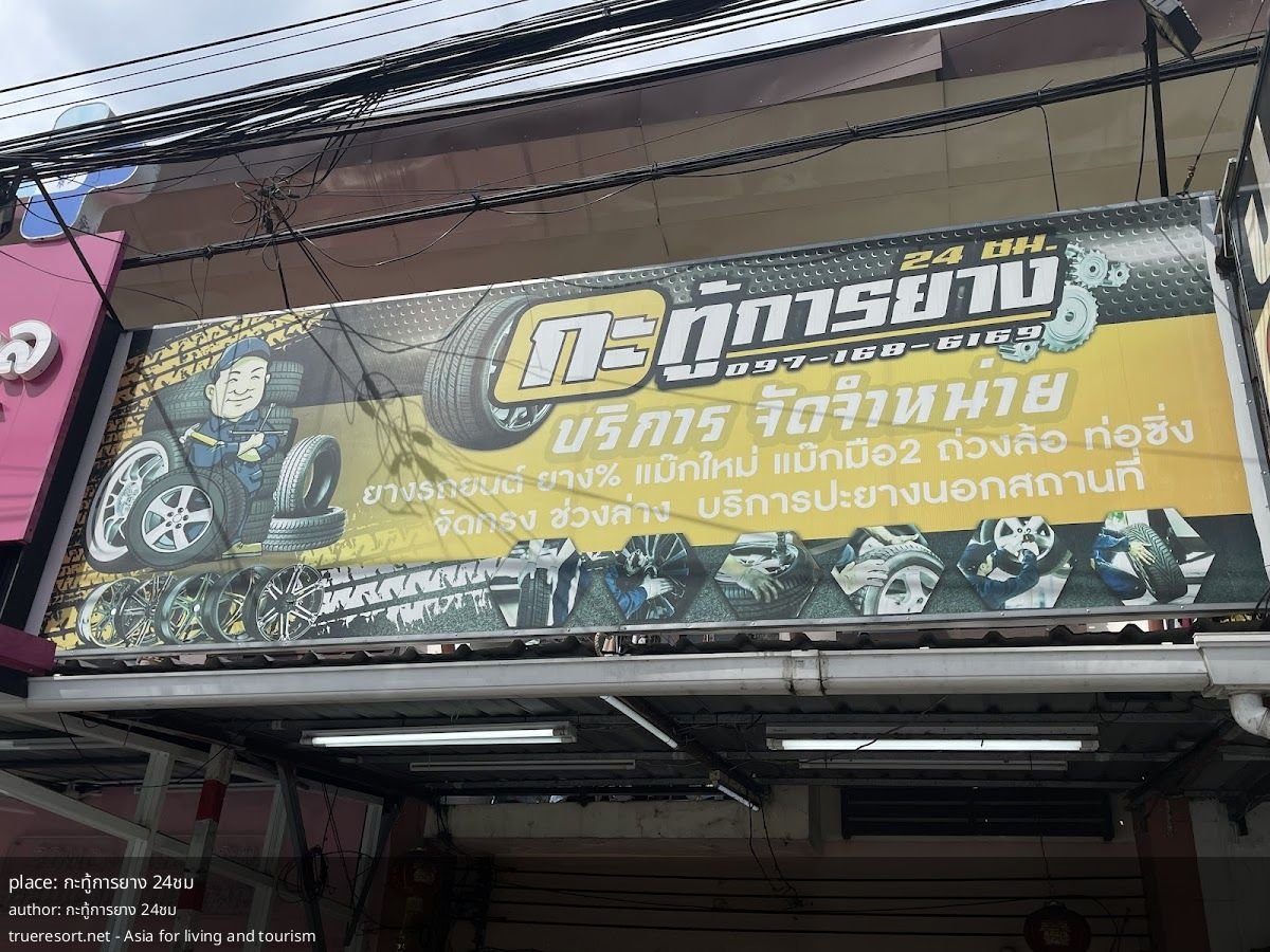 Где: мастерская по работе с шинами, название — กะทู้การยาง 24ชม. Рейтинг: 5/5 на основе 4 отзывов. График: круглосуточно, 7 дней в неделю. Место находится в районе с гостиницами и кафе, поблизости указаны Kathu Place Apartment и 1987 Slow Bar Coffee, что удобно при ожидании или трансфере.