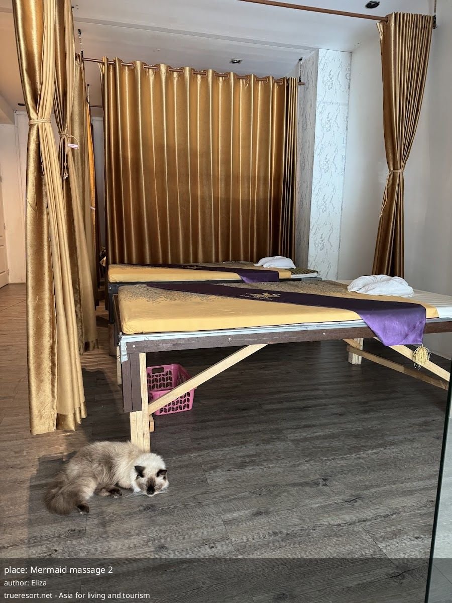Mermaid massage 2 получает высокую оценку гостей за профессионализм терапевтов, чистоту и дружелюбие персонала; заметные плюсы — ароматная атмосфера, послепроцедурный чай и домашний кот как часть гостеприимства. Если вам важны проверенные техники (тайский массаж) и лёгкая постпроцедурная забота (алоэ-вера и чай), этот салон по отзывам заслуживает внимания в Равае. Перед визитом рекомендую уточнить доступность сеансов в вечерние часы и возможность выбора конкретной процедуры.