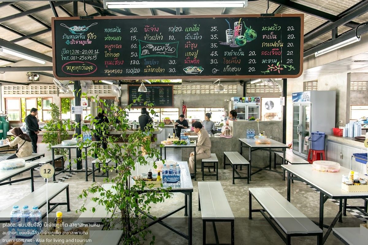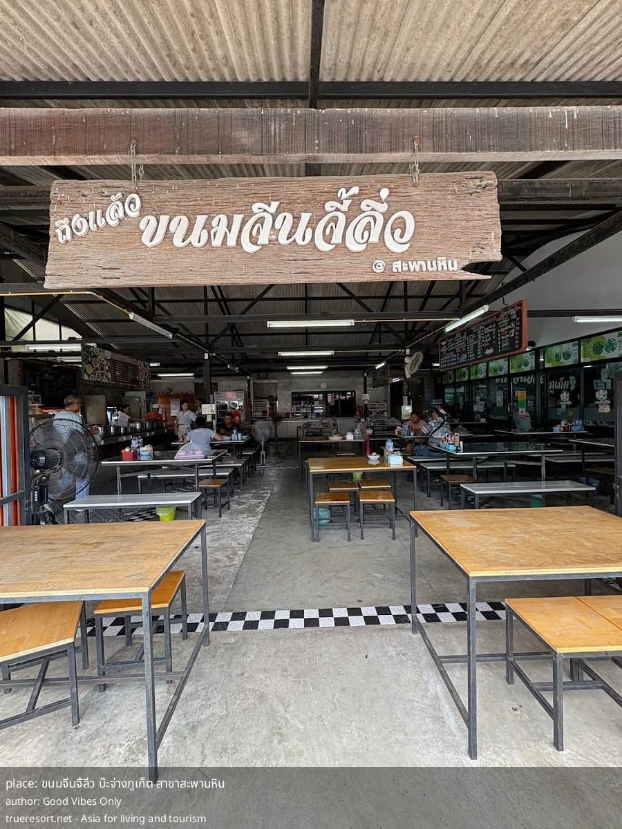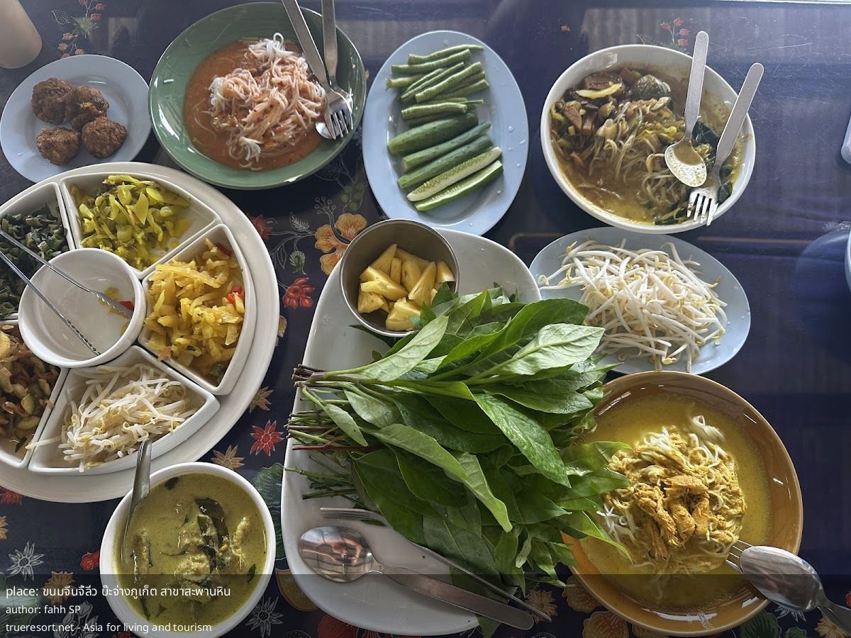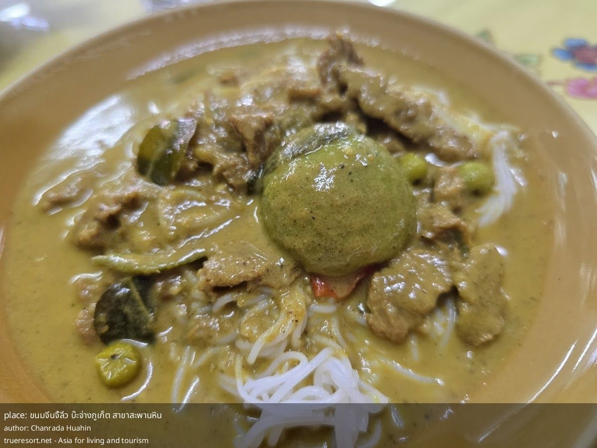 Здесь подают кханом джин — рисовую лапшу с карри и овощами, рекомендованное блюдо Kanom Jeen Kang Nuea часто упоминают как удачное сочетание с жареной курицей; посетители хвалят свободный доступ к свежим овощам и маринадам/кимчи, что удобно, если хотите, чтобы ребёнок собрал себе тарелку сам.