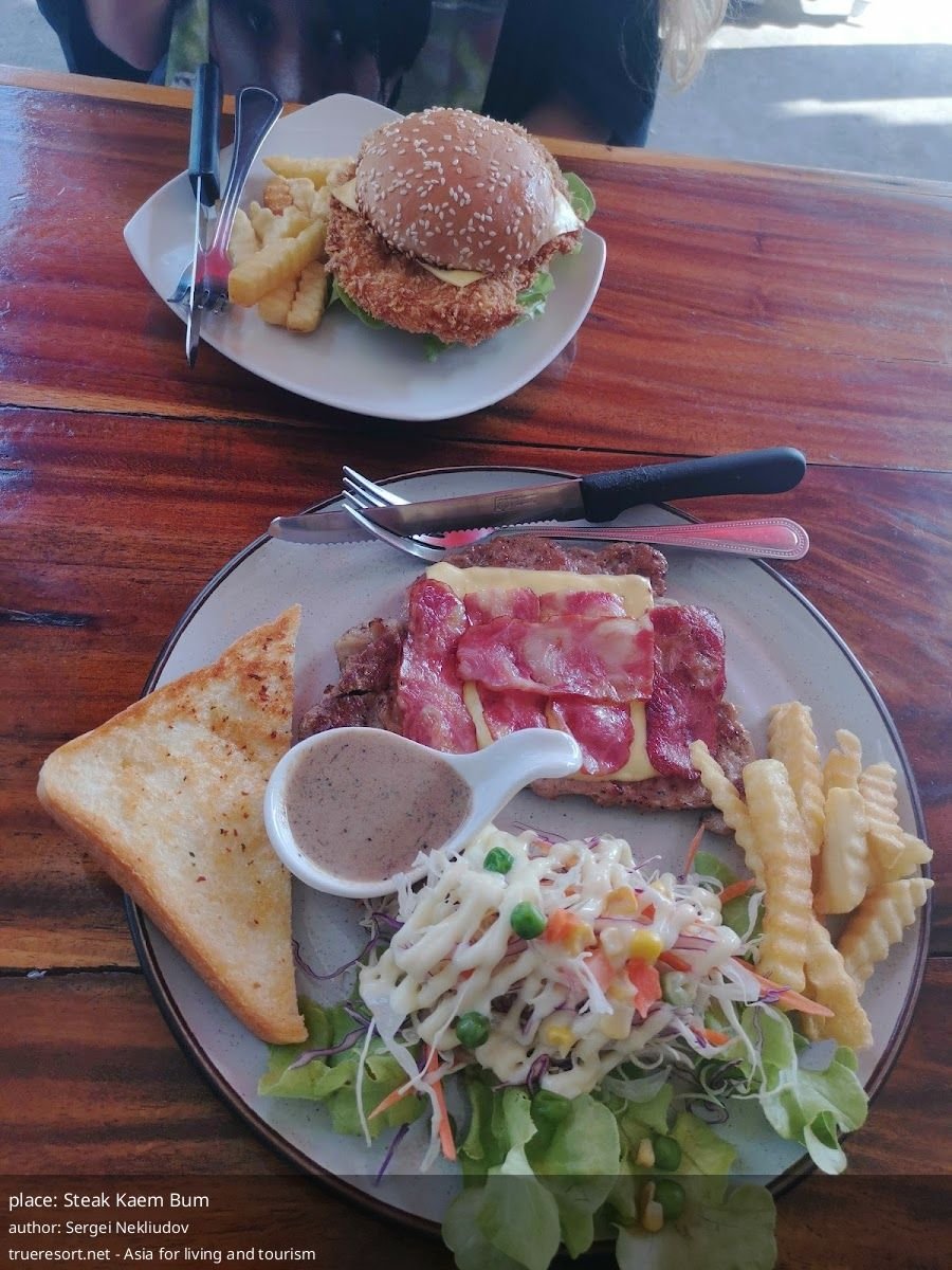 Агрегированные отзывы системно указывают на вкусную западную кухню и щедрые порции. Один посетитель отметил выраженную экономию — сочетание стейка, свинины, курицы, салата, картофеля и двух пива обошлось примерно в 8 USD; это прямой сигнал о сильном ценовом преимуществе в локальном контексте.