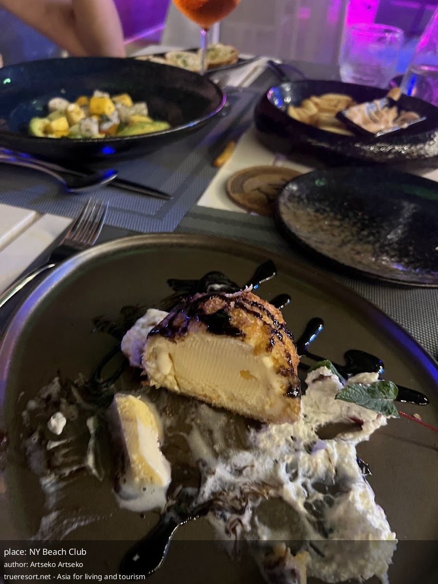 Коктейли в NY Beach Club получают отдельные похвалы за качество и баланс, гостям особенно запомнилась высокая планка барменской работы. Пицца отмечена как необычно свежая даже по сравнению с опытом визитёра после полугода в Италии. Из конкретных блюд выделяются мидии в белом соусе, которые один из гостей назвал действительно вкусными.