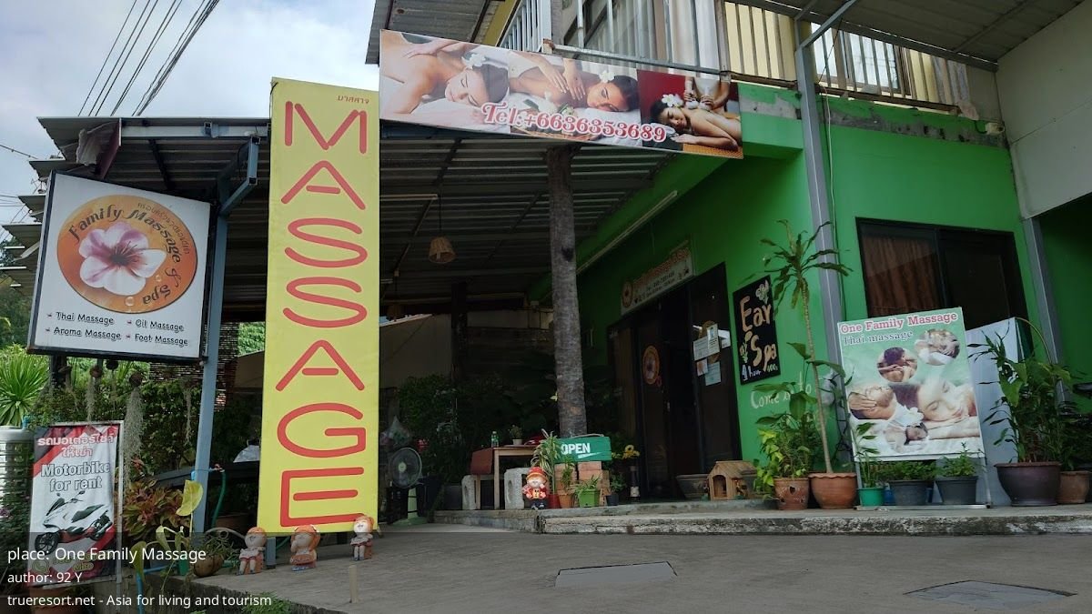 One Family Massage — массажное заведение с оценкой 4.6 по 72 отзывам и графиком работы ежедневно с 10:00 до 23:30. Данные о соседних точках показывают расположение рядом с локальными ресторанами и отелем Say Hi Phuket, что помогает понять контекст для туристов и местных гостей.