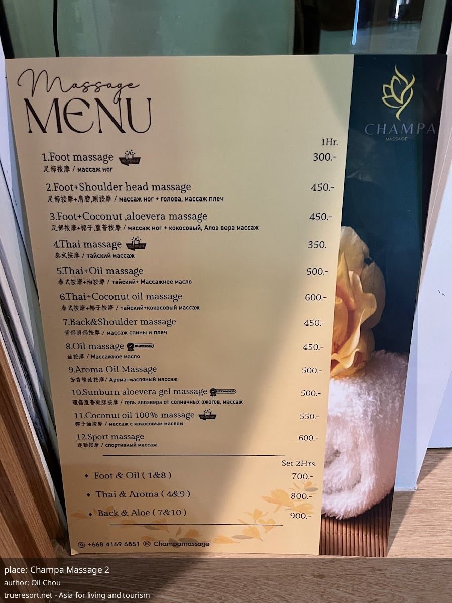 Champa Massage 2 — рабочая студия в туристической зоне Пхукета с опытными массажистами, удобными часами и практичными сервисными фишками. Подходит тем, кто готов к насыщенному воздействию на мышцы и ценит ощутимый результат; для остальных гостей важна предварительная договоренность об уровне давления и бронирование времени.