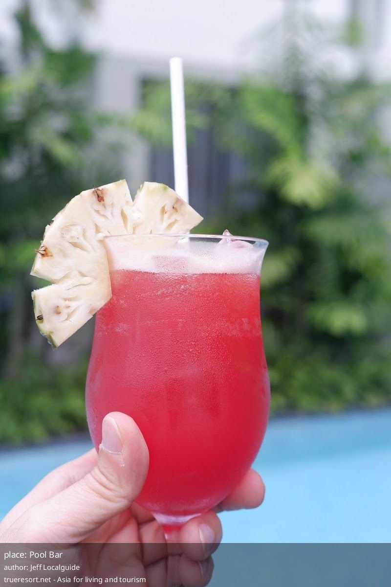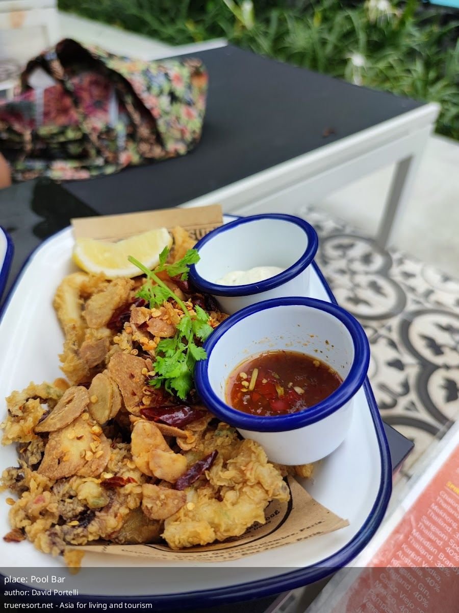 В отзывах прямо упоминаются бургеры, которые получают положительные оценки, что свидетельствует о наличии простой барной кухни, подходящей для ленивого обеда у бассейна.
