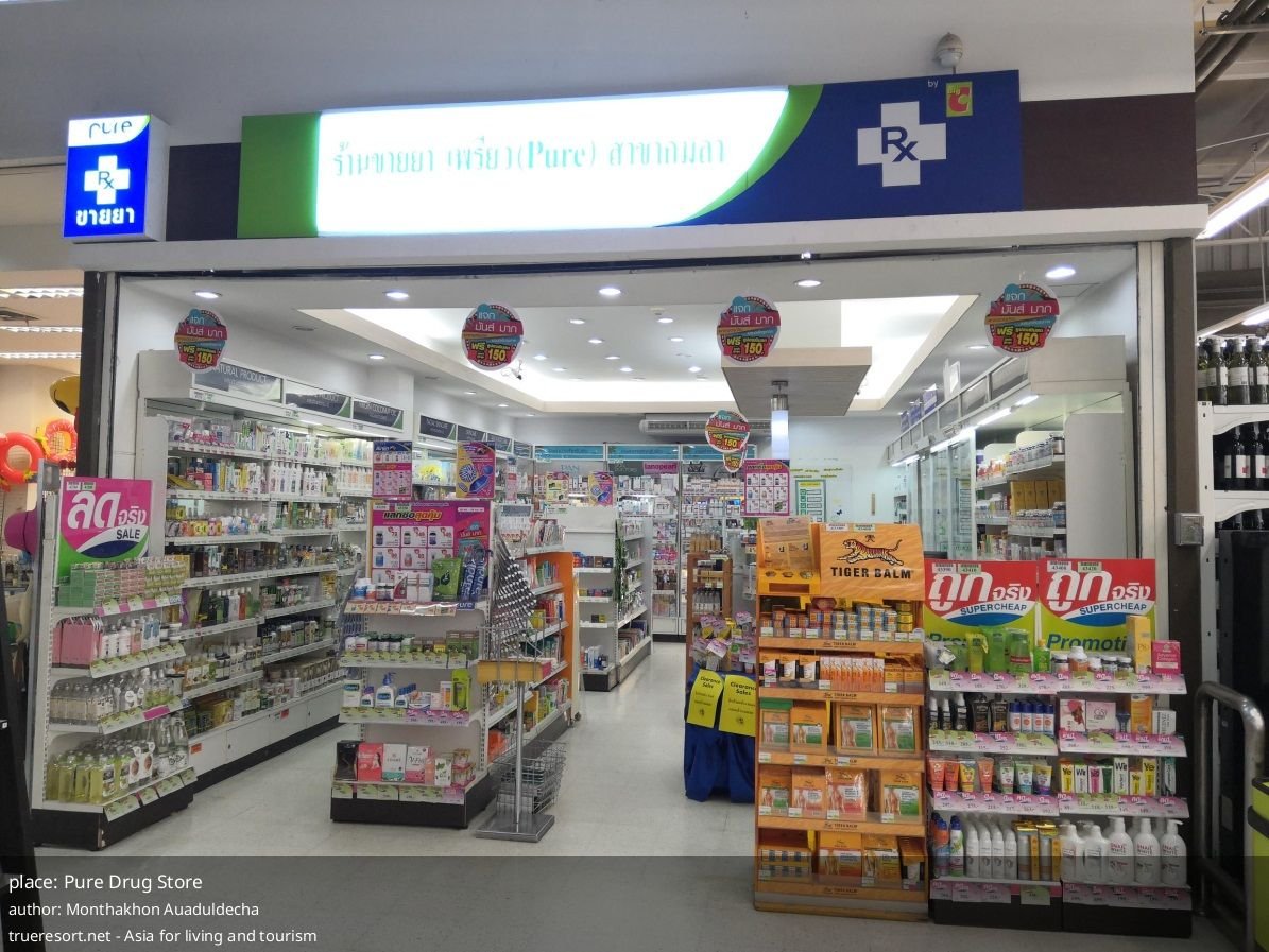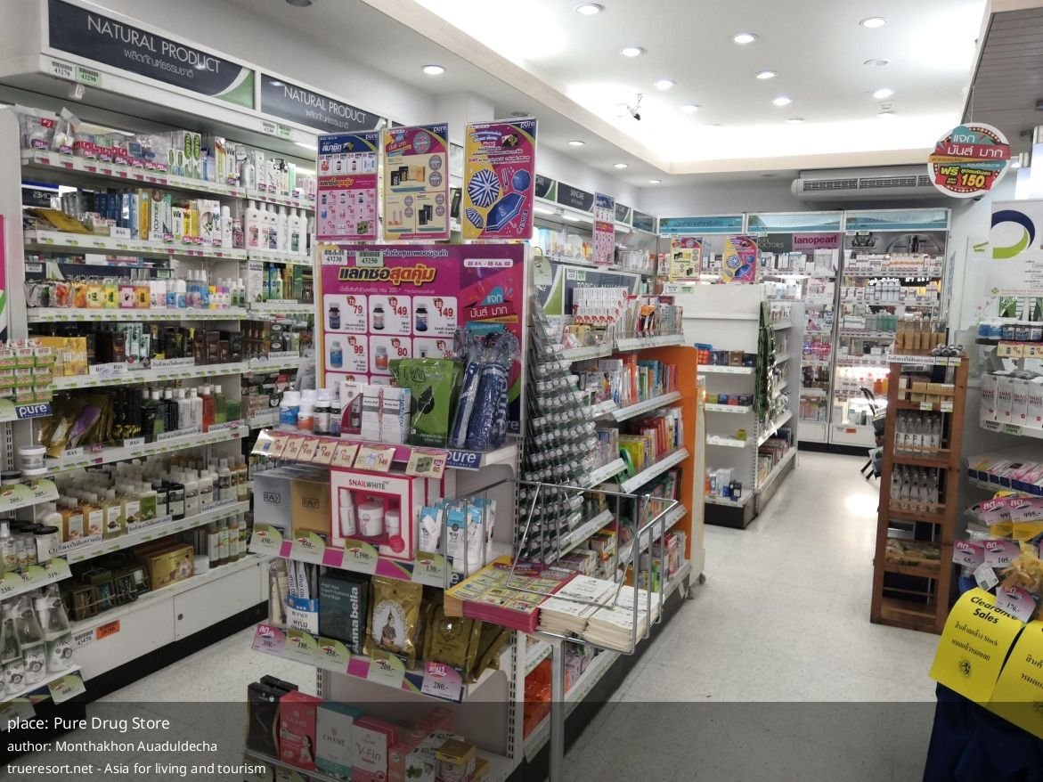 Pure Drug Store аптека с кажущимися широкими часами, но посетители предупреждают: фармацевт часто отсутствует, купить ибупрофен невозможно