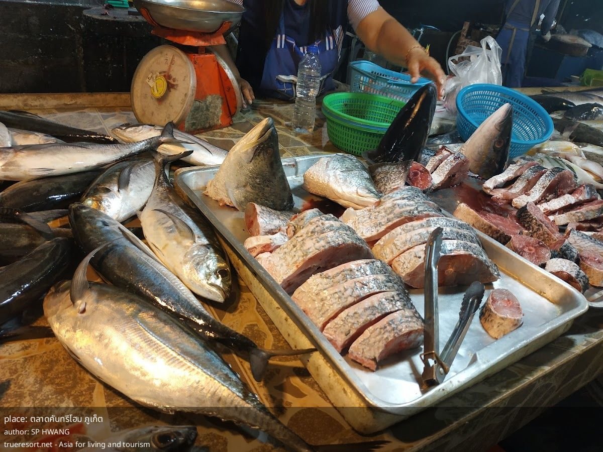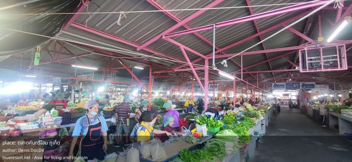 Рынок ตลาดคันทรีโฮม ภูเก็ต: приезжайте до 6–8 утра за самой свежей дешёвой рыбой, фруктами и овощами — к полудню закрыт, мало сидячих мест и жарко