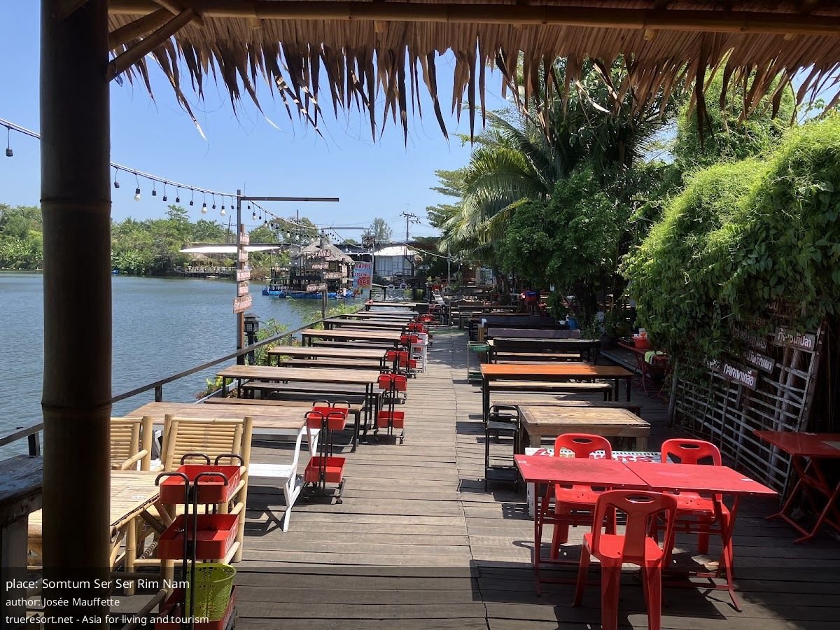 Somtum Ser Ser Rim Nam одновременно шокирует и восхищает: живая музыка, вид на озеро и гигантское меню — но еда не всегда удачна
