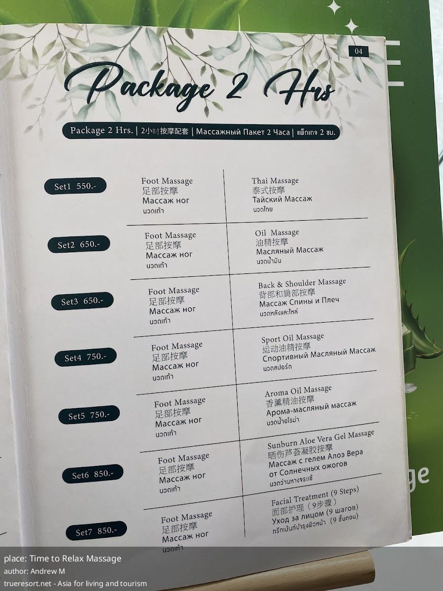 Time to Relax Massage получает смешанные оценки: значительная часть посетителей указывает на высокое качество тайского и ножного массажа и аккуратность помещения, при этом встречаются жалобы на попытки добавить услуги и запросы на доплату уже во время процедуры. Если ваша цель — качественный массаж по умеренной цене, приходите с чётким планом услуги, согласуйте стоимость заранее и просите желаемую зону или мастера на этапе записи.