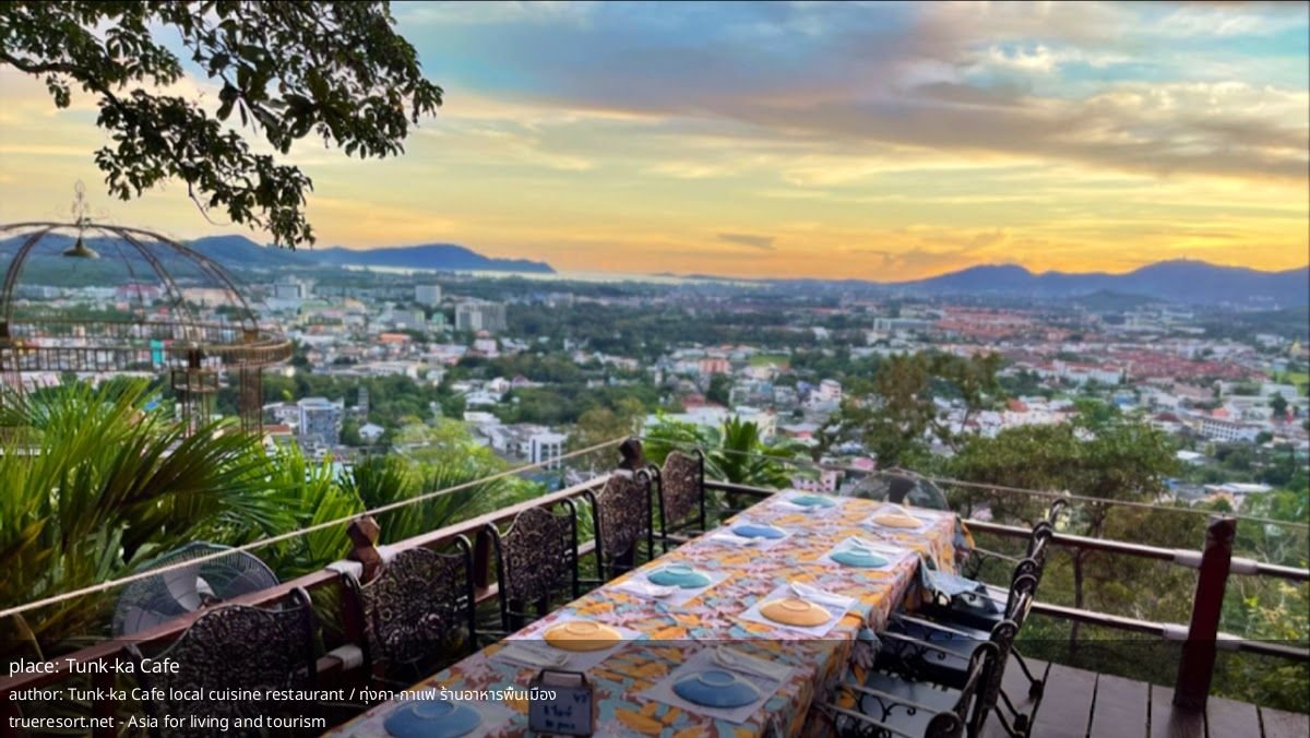 Заведение продаёт не столько интерьер, сколько вид — столы с панорамой Пхукет-Таун можно заранее забронировать. Это место позиционируют как аутентичное и местные советуют его уже более полувека, что даёт ощущение стабильности и исторической привязки.