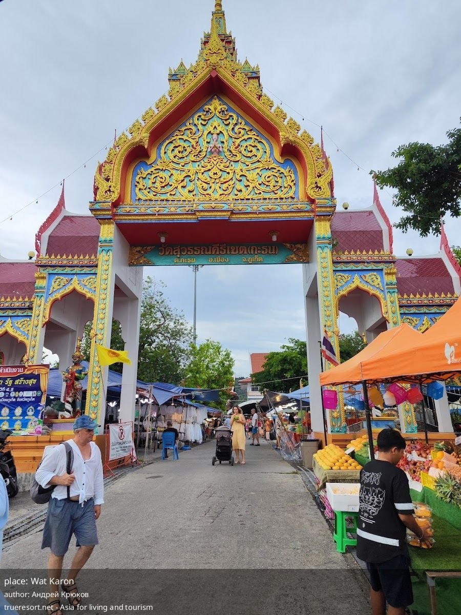 Гости называют это место храмовым рынком рядом с Wat Karon; внутри самого храма вход для посетителей запрещён, но снаружи можно делать фото. Рынок расположен в зоне, где есть ночной рынок Karon и несколько отелей и кафе — это полезно учитывать при планировании прогулки после захода солнца.