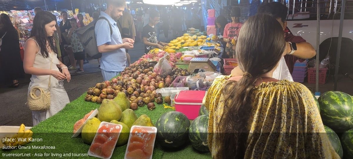 Wat Karon: реальная картина рынка — работает во вторник и пятницу с 12 до 22, многолюдно, дешёвая еда ниже пляжных цен, насекомые деликатесы, торг редок