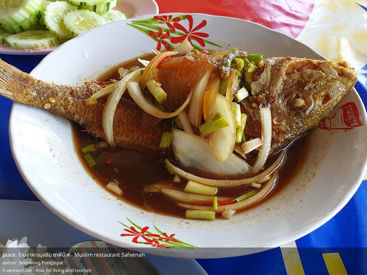 Здесь готовят тайские блюда по-хозяйски: порции большие и рисом не жалеют — если хотите экономично и сыто, это место для вас. Возьмите пакет карри: около 50 бат за порцию, которой хватит на 2–4 человека — фантастически выгодно для групп. Рыба жареная — свежая, вкусная, ловко приготовлена и вызывает искренний восторг. Поскольку у заведения халяльный профиль, свинины не найдёте, и это выбор сознательный, а не ошибка меню.Сервис и расписание: дружелюбие с ограничением по времени