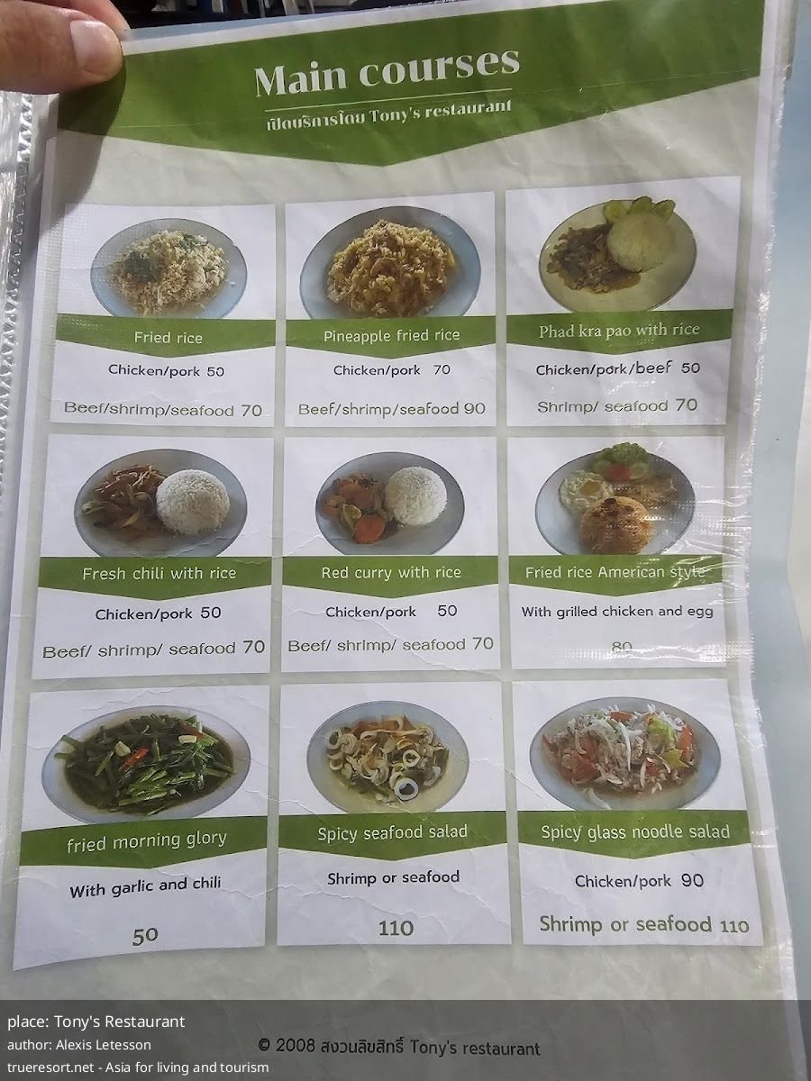 - Ценовые маркеры подтверждаются примерами: базовая курица‑гриль с овощами — 80 бат плюс 10 бат за рис, парёная рыба с овощами — примерно 100 бат.